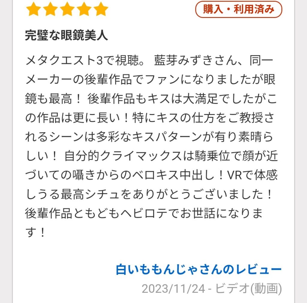 白のももんじゃが、感想しますじゃー!主人公が勉強してると家庭教師のみずきさんが入ってくる。回答を見てくれるが4割くらいしか、出来てない!励ましてくれるみずきさん。捗らない原因を探るうちに主人公に彼女が出来た事が発覚。馴れ初めなどめっちゃ聞いてくるんじゃ。「先生、教え子の恋愛話好きなんだー」と、ノリノリ。「もしかして彼女が気になりすぎて勉強手につかない?」「手は繋いだけどキスはまだなんだー」「どうやってキスしたらいいか、わからないんだー」色々、聞いたみずき先生の提案はな、なんと、「その娘とえっちする時のために勉強しようか」「これも授業の一環だから」と、徐々に接近、キス。眼鏡の奥の瞳がヤバい。「ちょっとぎこちないね。」と何度もキス。「女の人の唇の感触どう?」「さっきは優しい感じのキスだったけど、激しいのも練習しようか」「舌を出してみて」とみずき先生自身ベローンと出してきてのキス。「どう?舌の感覚とか。ちょっと気持ちよかった?」こんなの蕩けるんじゃー。「慣れるまで練習してみる?ベロは相手にからめる様に」VRキスの見えない部分まで想像させてくれる台詞素晴らしいんじゃ!「どうかな?少しは慣れた?「え、ベロ吸っても良いかって?ハイレベルだけどいいと思うよ。」「先生としてみようか」凄い音をたててベロチュウ。エロいんじゃ。先生の吐息を感じるんじゃ。「意外と上手に出来るじゃん。ね、先生に舌吸って欲しいよね。舌、思いっきり出してみて」また音たてて激しくベロチュウ。潤んだ瞳で「どう?気持ちいいでしょ。キスの仕方わかったかな?」「彼女とキスしてくるんだよ」と勉強(本当の)に戻る。