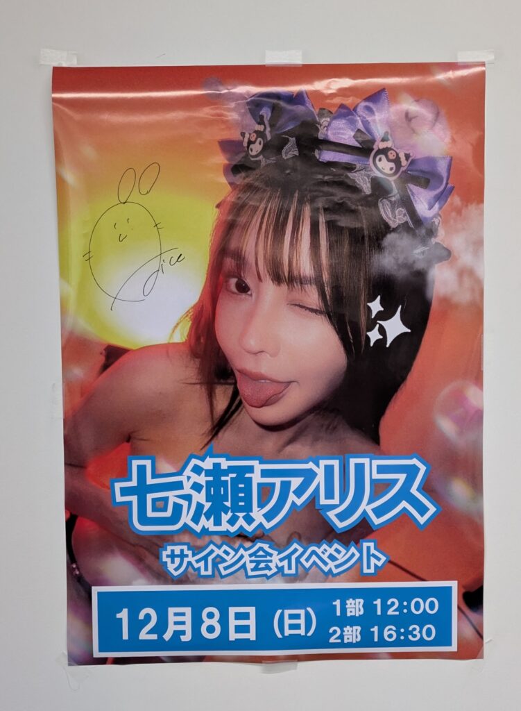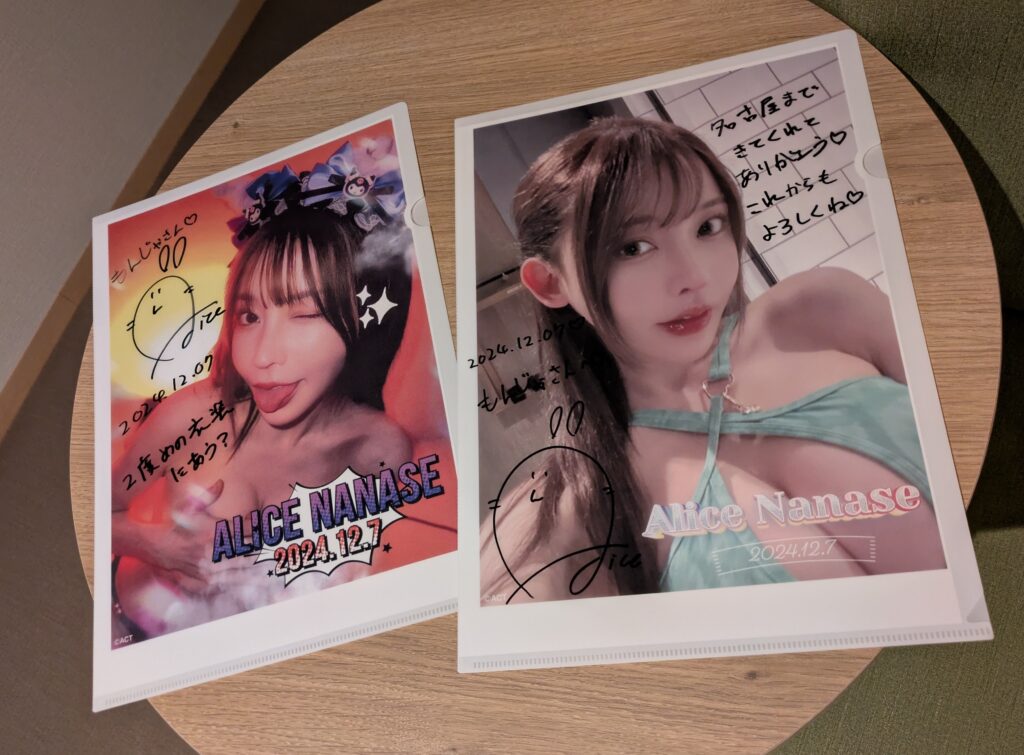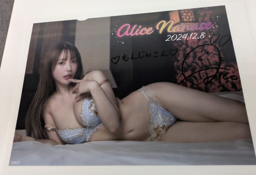 基本分は色紙に(持ち込み物でもOK)サイン書いて貰い、これのみアリスさんのコメントが!頂いたコメントがめっちゃ自分的にツボを突いて感動!DJイベで好き度は天井到達してたが、初号機出てきて天井破壊されたくらいインパクト!もっと好きになった!内容はナイショで!